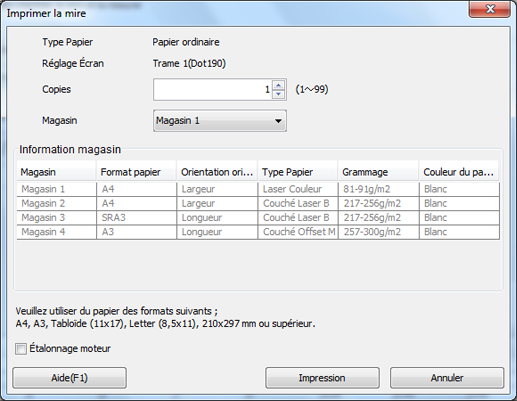 Sur l'écran Imprimer la mire, définissez Copies et Magasin. Après le réglage, cliquez sur Impression.