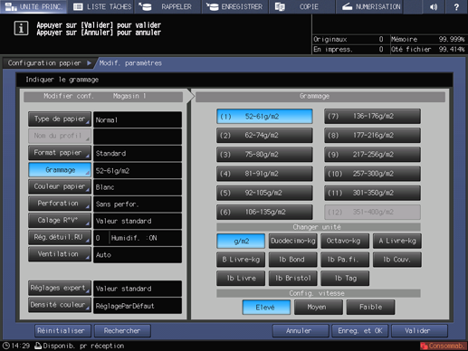 2. Sur l'écran tactile de l'imprimante, appuyez sur Réglage papier sur l'écran UNITÉ PRINC.