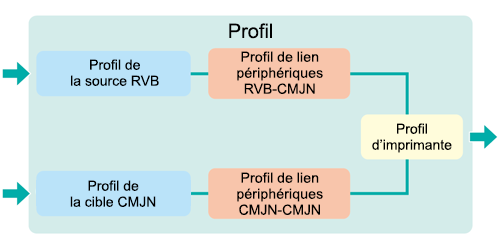 Profil de la source RVB, Profil de la cible CMJN, Profil de l'imprimante, Profil de lien périphérique RVB-CMJN et Profil de lien périphérique CMJN-CMJN.
