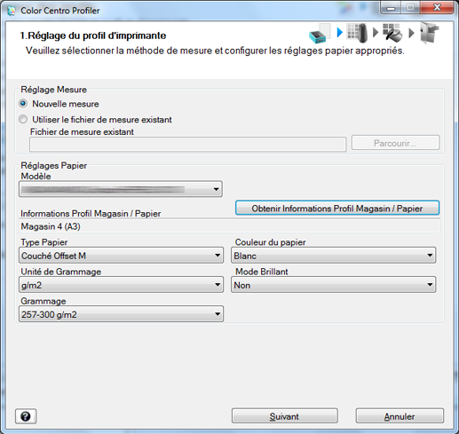 5. Sélectionnez Nouvelle mesure sous Réglage Mesure et cliquez sur Obtenir Informations Profil Magasin / Papier.