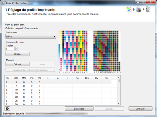 15. Lorsque vous avez terminé la mesure de la mire, cliquez sur la touche Suivant de l'écran 1. Réglage du profil d'imprimante.