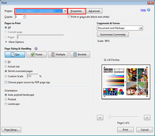 2. Sélectionnez l'imprimante à utiliser pour l'impression et cliquez sur Propriétés.