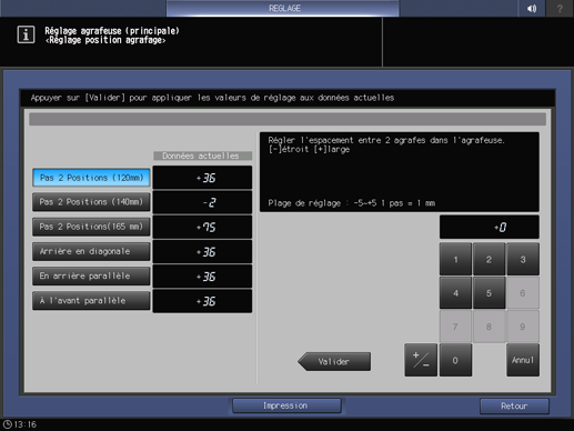 Appuyez sur Pas 2 Positions (140 mm). Entrez la valeur suivante et appuyez sur Valider.