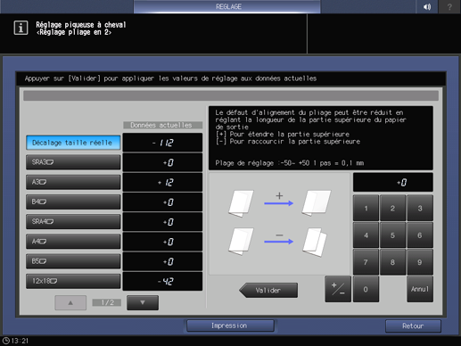 Cette fonction permet de régler le bord supérieur extérieur du papier plié (position de pliage) en cas de défaut d'alignement de la position de pliage en deux, en spécifiant la valeur qui convient.