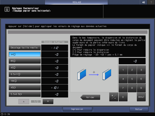 En cas d'erreur d'alignement des pages du corps dans la section passage ou de la première moitié des pages de corps, réglez la largeur pour réduire le défaut d'alignement et la courbe.