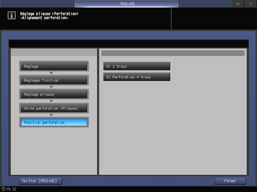 Appuyez successivement sur Réglages finition, Réglage plieuse, Unité perforation (Plieuse) et Position perforation.