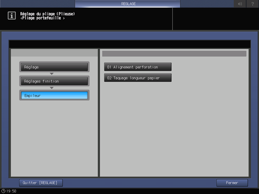 Appuyez consécutivement sur Réglages finition, Empileur et Taquage longueur papier.
