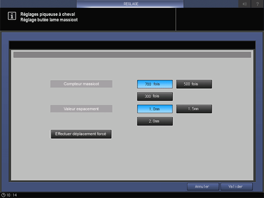 Un réglage technique est nécessaire pour afficher Butée lame massicot à l'écran. Contactez le technicien SAV.