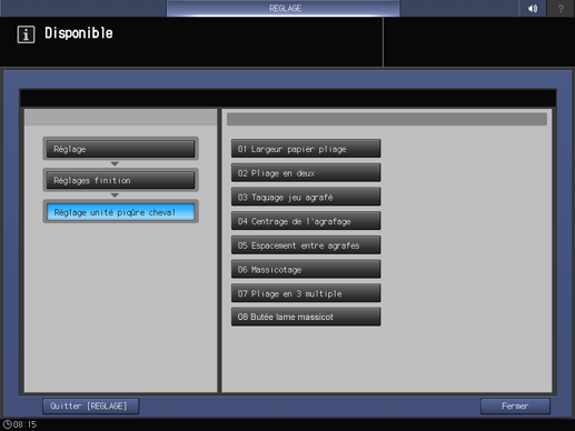 Appuyez successivement sur Réglages finition, Réglage unité piqûre cheval et Butée lame massicot.