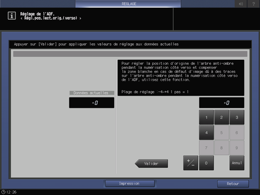 Appuyez successivement sur Réglage chargeur d'originaux et sur Régl.pos.lect.orig.(verso).