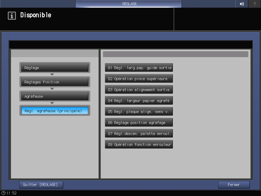 Appuyez consécutivement sur Réglages finition, Réglage agrafeuse, Réglage agrafeuse (principale) et Opération pince supérieure.
