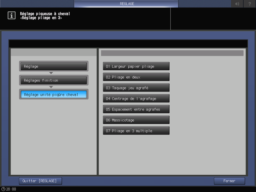 Appuyez successivement sur Réglages finition, Piqueuse à cheval et Largeur papier pliage .