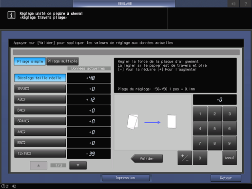 Si un réglage est nécessaire, appuyez sur Retour réglage pour revenir à l'écran Réglage travers pliage.