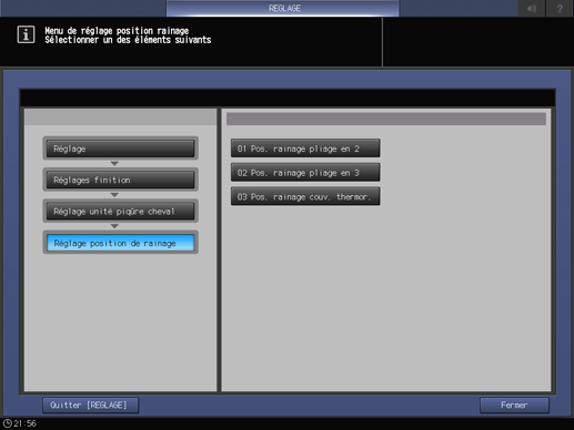 Appuyez successivement sur Réglages finition, Réglage unité piqûre cheval, Réglage position de rainage et Pos. rainage pliage en 3.