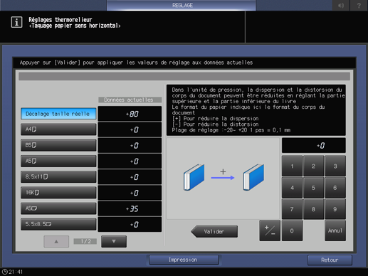 Si un réglage est nécessaire, appuyez sur Retour réglage pour revenir à l'écran Taquage papier sens latéral.