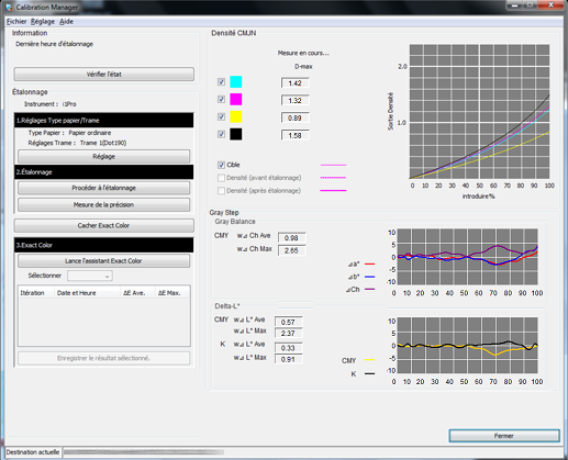 Vérifiez les résultats de mesure (densité CMJN et niveau de gris) sur l'écran Calibration Manager.