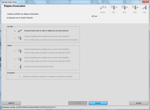 L’assistant d'exécution de la fonction Exact Color démarre et affiche l'écran Etapes d'exécution.
