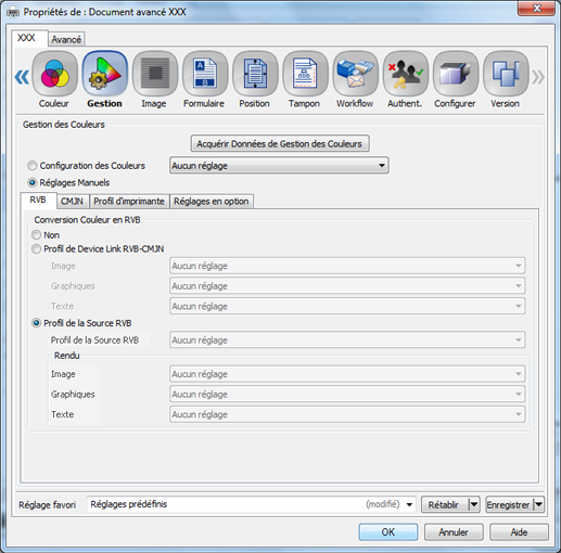 Explication supplémentaireIl est recommandé d'enregistrer les réglages de sortie couleur fréquemment utilisés dans la configuration des couleurs. (Voir Enregistrement de la configuration couleur.)
