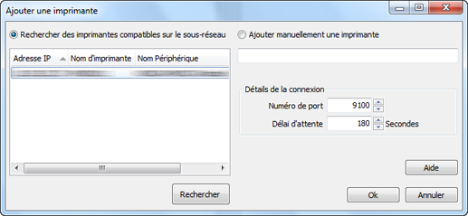 Nom ou adresse IP de l'imprimante réseau | Ajouter manuellement une imprimante. Entrez le nom ou l'adresse IP de l'imprimante à ajouter et cliquez sur Valider. |