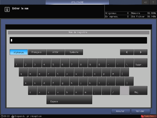 Lorsque vous effleurez un élément qui autorise la saisie de caractères, l'écran de saisie des caractères apparaît.