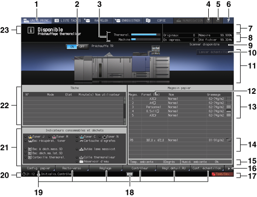 22 | Zone d'affichage des tâches | Affiche l'état actuel des tâches demandées à la machine. En cas de travaux incomplets, la touche Hist. incomplet s'affiche. |