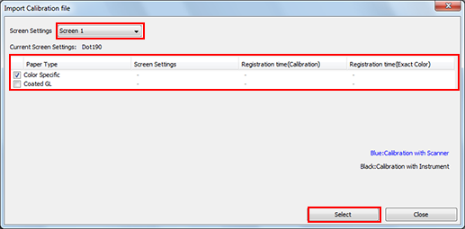 L'écran Sélectionner le fichier du tableau de calibrage s'affiche.