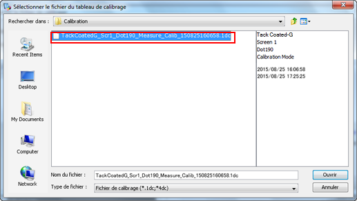 Sélectionnez un tableau d'étalonnage et cliquez sur Ouvrir.