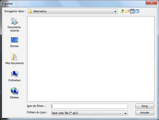 Vous pouvez exporter un tableau de couleurs spot du contrôleur d'image dans Local, Mes documents ou Réseau (extension : .sp3).