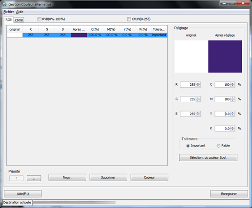 Vous pouvez dupliquer les réglages de couleur alternatives affichés sur l'écran Gestion Couleur alternative dans la même table de couleurs alternatives. Lorsque vous utilisez le réglage de couleur alternative existant pour ajuster la couleur alternative, les réglages originaux de la couleur alternative sont écrasés. Si vous souhaitez enregistrer les réglages actuels, dupliquez-les.