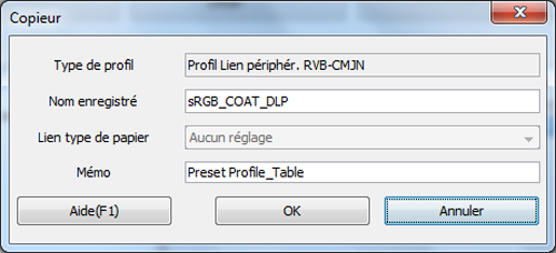 Explication supplémentaireVous ne pouvez pas enregistrer le profil de lien périphériques RVB-CMJN sous un nom utilisé dans le contrôleur d'image.