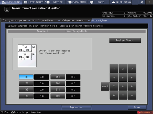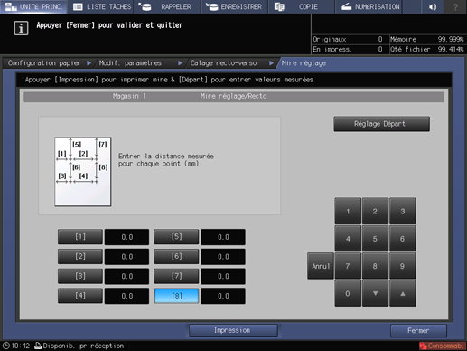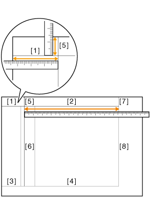 Réimprimez la mire de réglage du recto et vérifiez les longueurs aux points [2], [4], [6] et [8] de la seconde et troisième mires de test.
