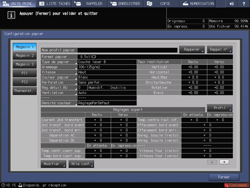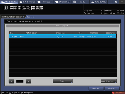 Sélectionnez un profil papier dont la marque (nom profil papier), le « format papier», le « type papier » et le « grammage »correspondent à ceux du papier à régler, puis appuyez sur Valider.
