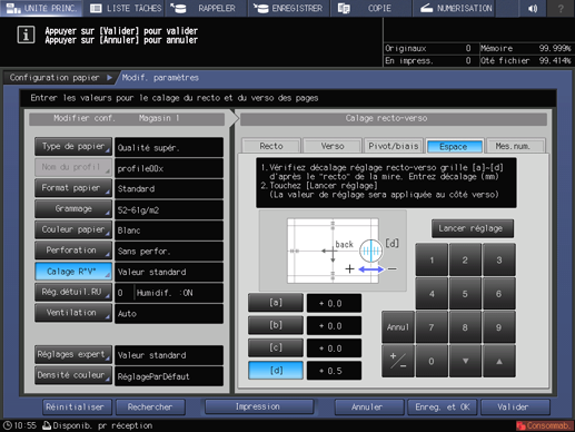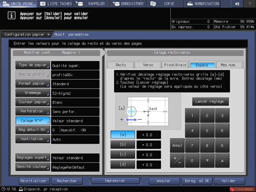 Le réglage Espace est une méthode simple qui permet de régler uniquement l'agrandissement et la position image du verso. Pour procéder au calage des deux faces, effectuez la procédure affichée dans Réglage [recto].