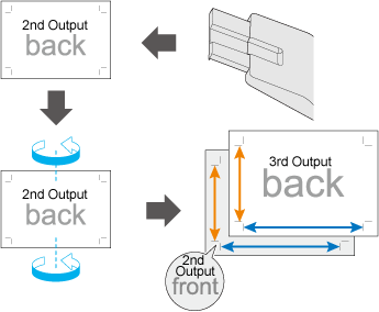 Placez la troisième mire (verso vers le haut) sur la seconde mire (recto vers le haut), puis comparez l'intervalle de l'image au recto avec celui de l'image au verso. Pour inverser le papier, définissez l'axe de rotation dans le sens transversal.