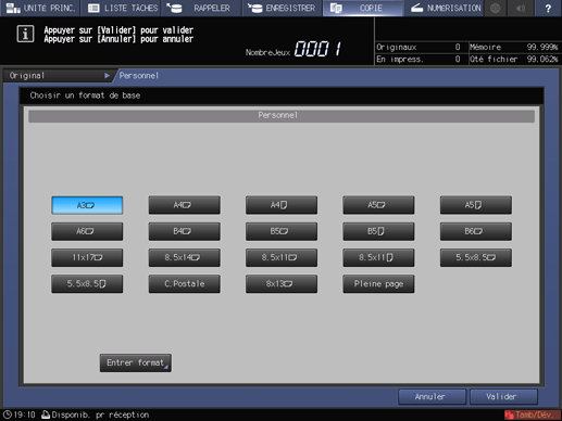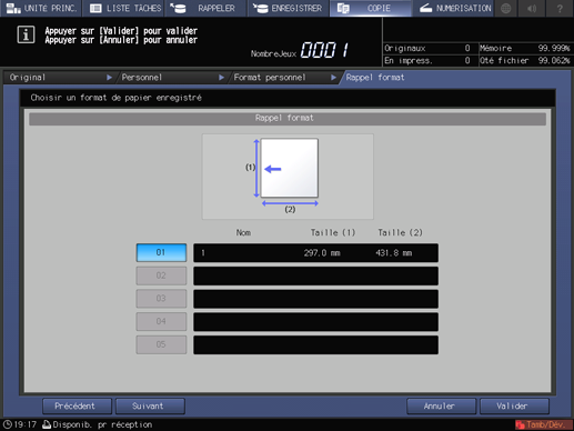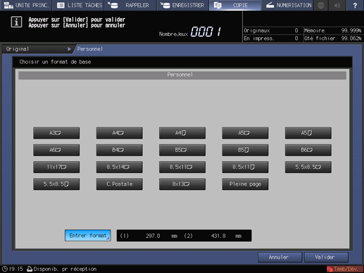 condition préalableVous pouvez enregistrer des formats personnalisés. Les informations de formats enregistrés peuvent être utilisés ultérieurement dans les réglages de format papier original et copie.