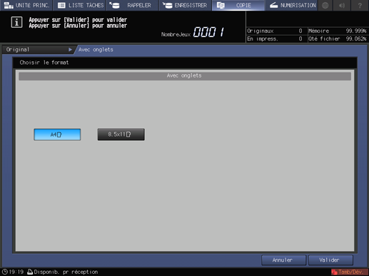 condition préalableLes formats d'originaux avec onglets acceptés sont uniquement A4Tlong edge feed / 8.5 11Tlong edge feed.