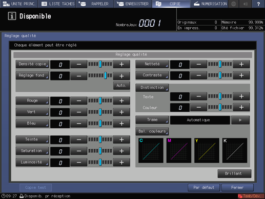 L'écran COPIE réapparaît. L'indication Densité copie se trouve sous l'onglet Réglage qualité de l'écran COPIE.