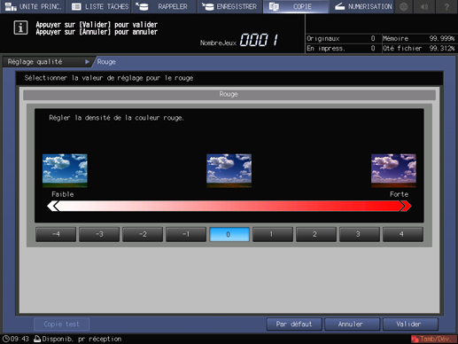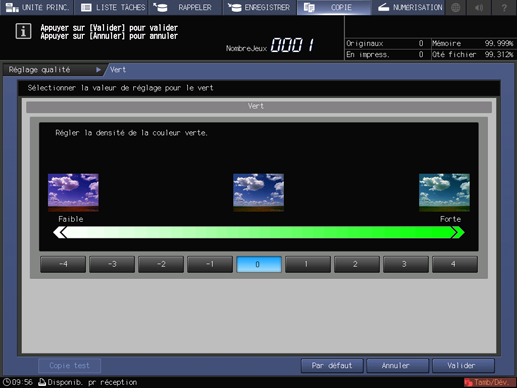 L'écran COPIE réapparaît. L'indication de la couleur modifiée se trouve sous l'onglet Réglage qualité de l'écran COPIE.