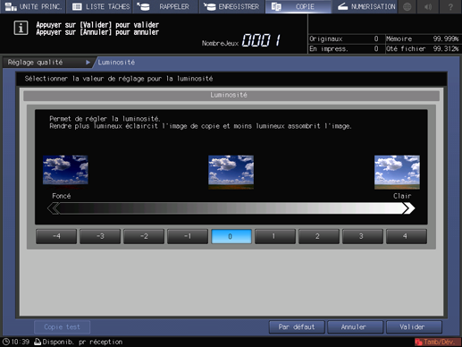 L'écran COPIE réapparaît. L'indication Luminosité se trouve sous l'onglet Réglage qualité de l'écran COPIE.