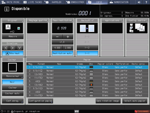 • condition préalableRestitution auto est incompatible avec Sélect.auto.papier mais Rotation image est disponible.