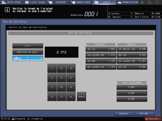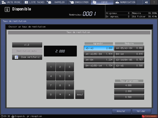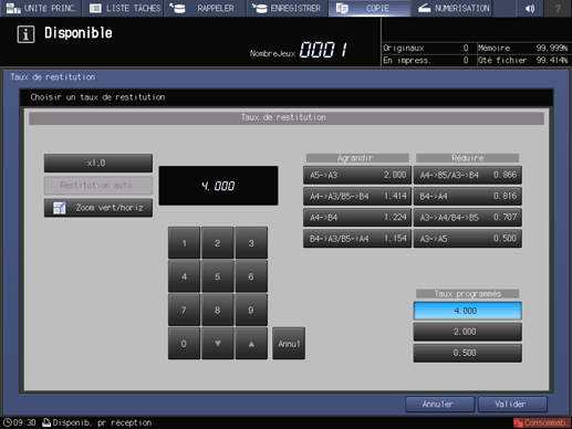 Les réglages Agrandissement/Réduction (fixe) et Taux programmés s'effectuent sur l'écran UTILITAIRE. Pour des détails, voir[Taux de restitution].