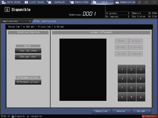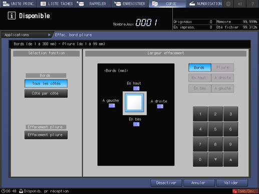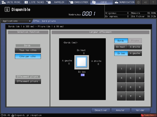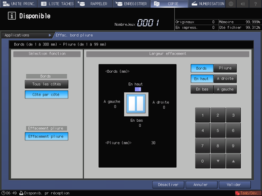 condition préalableVous pouvez définir une largeur d'effacement bords de 1 à 300 mm et une largeur d'effacement pliure de 1 à 99 mm en pas de 1 mm.