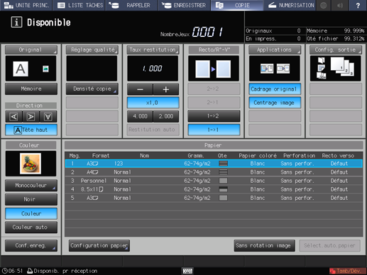 Les boutons Sélect.auto.papier et Restitution auto sont estompés et le facteur d'agrandissement x 1,0 est défini.
