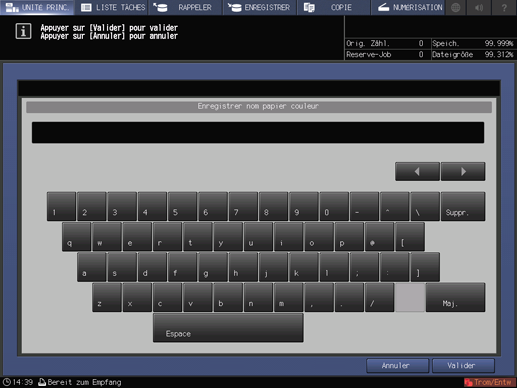 Explication supplémentairePour changer le nom de couleur spécifié, appuyez sur Saisie nom couleur pour afficher l'écran Saisie nom du papier coloré et renommez-la.
