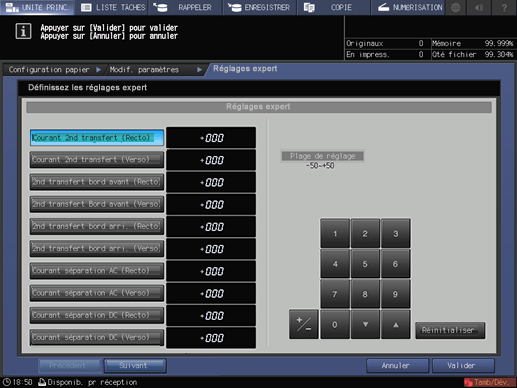 Réduction quantité toner, Densité JMC par magasin, Densité N par magasin, Détect. départ en double, Bour. si erreur centrage, Activation doigts sépar., Mode NB papier épais,Correction alimentation, Temps mobil.papier PFU, Roul.inf.fix. Niveau air ventil.refr., Séparation papier four/Niveau soufflerie, Conf.niv.aspiration air PFU, Paramètre séparation papier sortie