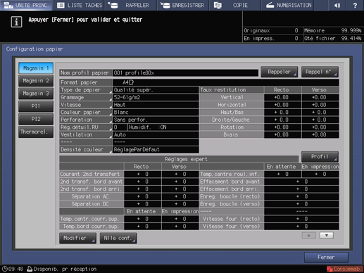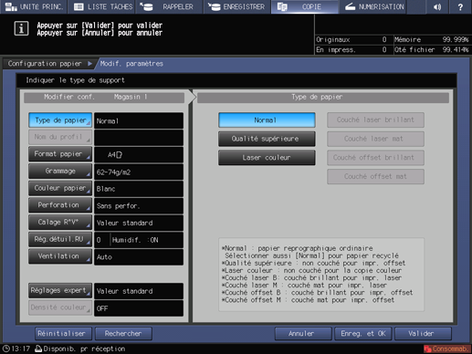 Explication supplémentaireRéglages expert n'est pas affiché dans la configuration par défaut. Pour effectuer les réglages expert du Réglage papier proposé sur l'écran UNITÉ PRINC. ou sur l'écran COPIE, contactez le technicien SAV.