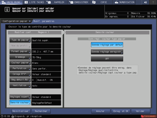 Explication supplémentaireLa sélection de Donn.régl.enre. affiche l'écran Liste réglage couleur par type papier.