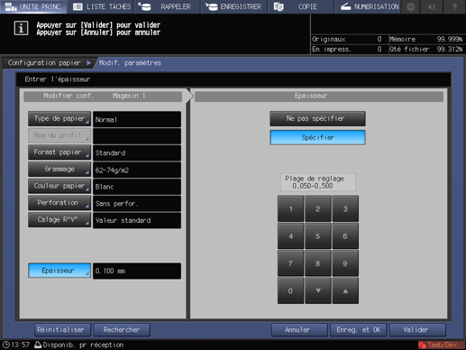La sélection Spécifier affiche le pavé numérique de l'écran tactile. Pour entrer la valeur de réglage, utilisez le pavé numérique de l'écran tactile ou downup. La plage disponible est comprise entre 0,050 et 0,500 mm.