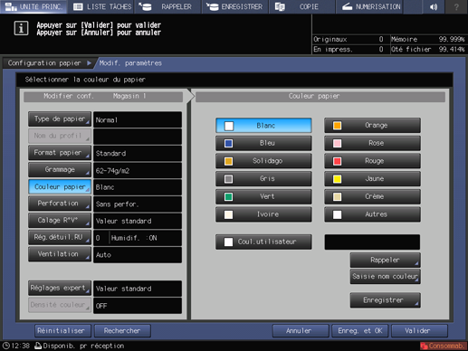 Vérifiez le réglage papier de chaque magasin affiché sous Papier.