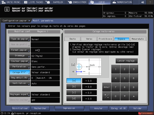 Si vous modifiez les réglages de Restitution, Décalage image, Rotation/biais et Mire réglage du recto ou verso, ou si vous effectuez le réglage Espace, l'indication de Calage recto-verso sur l'écran Modif.paramètres devient Valeur modifiée.